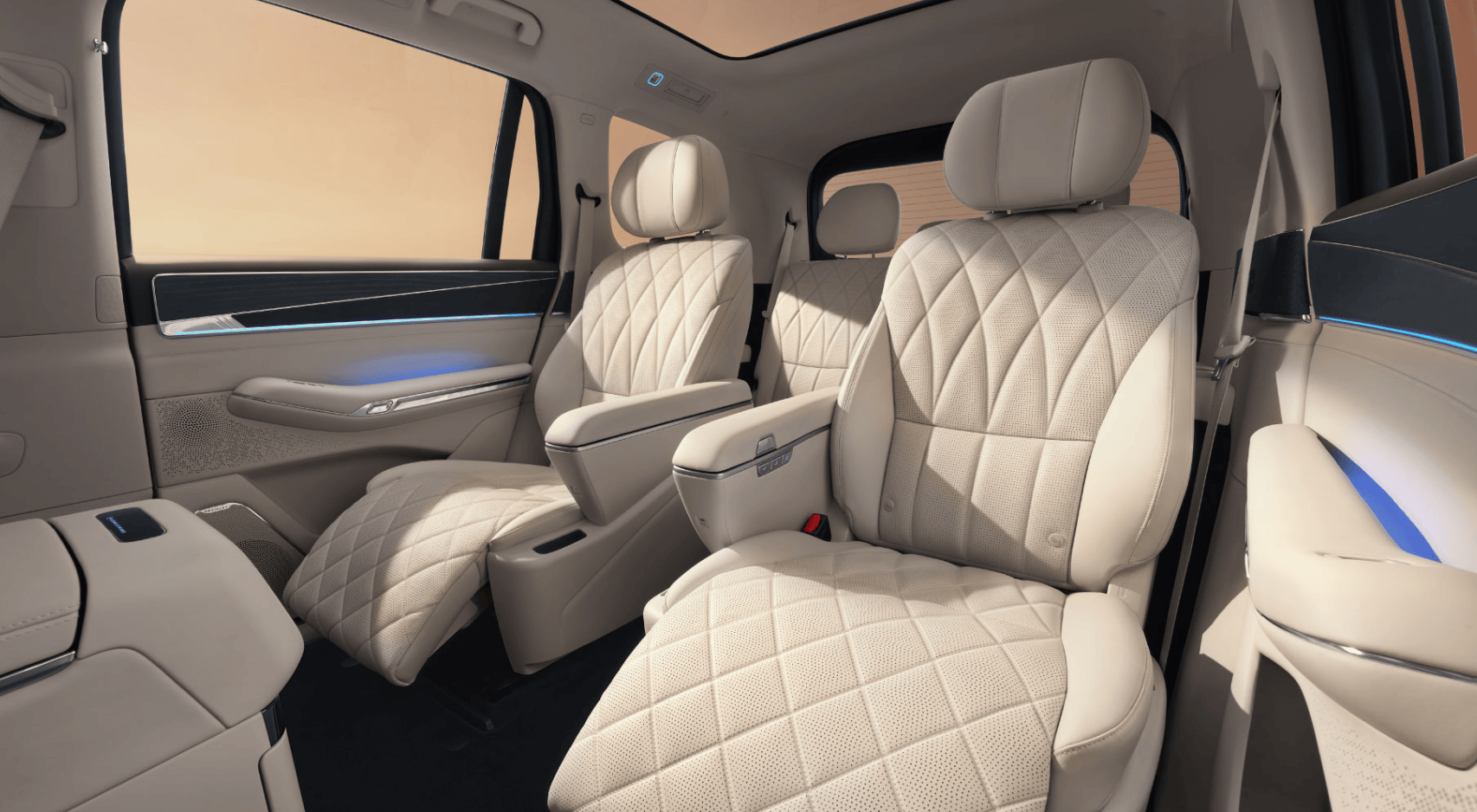 大唐EV的三围尺寸达到了5263/1999/1790mm,轴距更是长达3130mm,是名副其实的大块头。第二排配备的两张独立零压航空座椅,全系标配通风、加热和10点式按摩功能,靠背最大可调至146°,配合70°电动腿托,舒适度直接对标高端商务MPV。第三排同样没有妥协,得益于89.3%的得房率,成年乘客也能获得充裕的头部和腿部空间,彻底告别临时加座的窘迫,真正做到了对全车乘员一视同仁。配合47处车内储物空间以及252L的电动前备箱,无论是全家出游的行李还是商务接机的礼宾箱,都能轻松容纳。