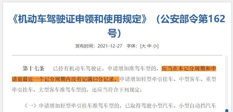 3、有机动车驾驶证,申请增加准驾车型的,应当在本记分周期和申请前最近一个记分周期内没有记满12分。也就是持有C1驾驶证在最近一年内没有记满12分记录。