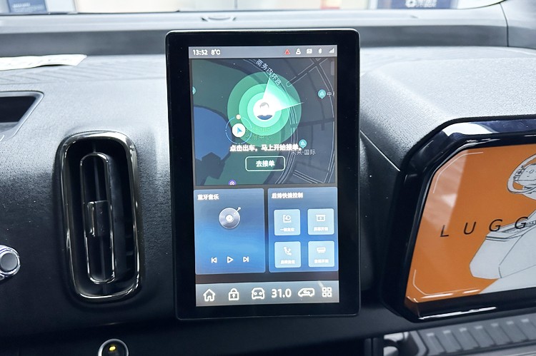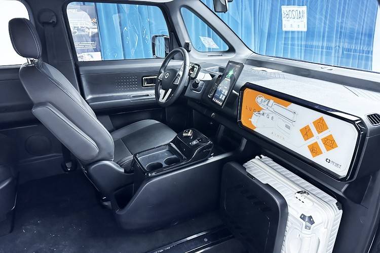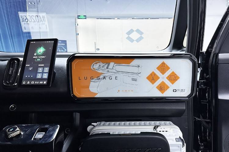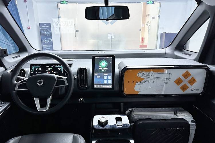 内饰上,新车配备了三辐式镂空方向盘、液晶仪表盘与大尺寸竖屏等,都是中规中矩的元素,没有什么特别之处。另外,副驾驶一侧配备了灯箱,可以内插广告,这个设计还是很有特点的。