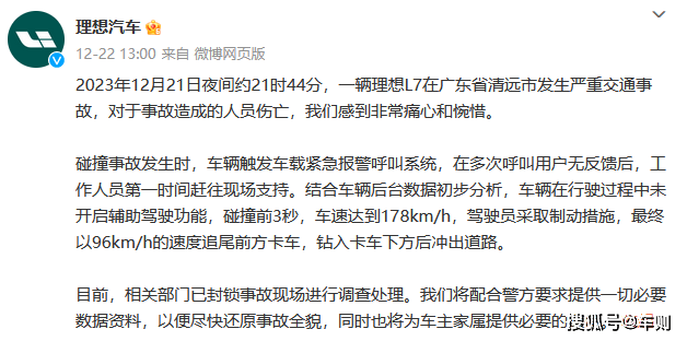 事故发生第二天中午,理想汽车在社交平台上对该事故进行回应称:2023年12月21日夜间约21时44分,一辆理想L7在广东省清远市发生严重交通事故,对于事故造成的人员伤亡,我们感到非常痛心和惋惜。