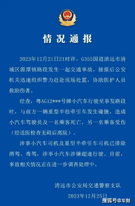 12月21日晚,一辆理想L7在G355国道清远市清城区源潭镇路段发生交通事故,在互联网上引发关注。12月25日,广东清远交警发布该事故情况通报,粤AG12XXX号牌小汽车与前方一辆中型半挂牵引车发生碰撞,造成小汽车驾驶员及一名乘客死亡,另一名乘客受伤(经送医检查无碍后离院)。