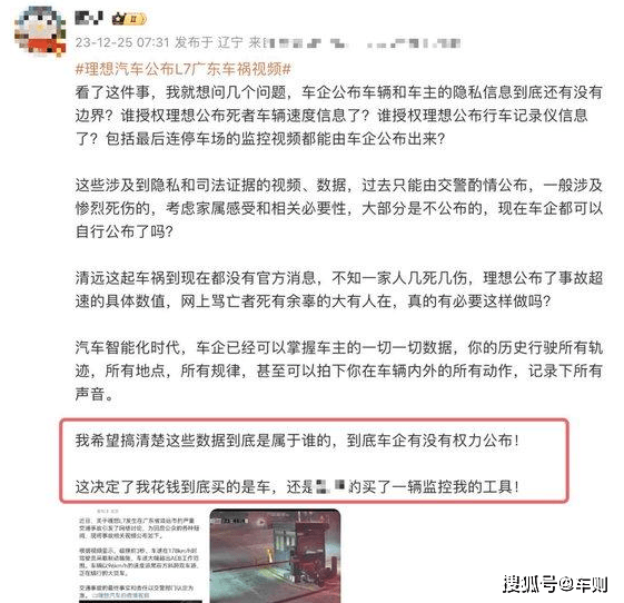 在理想汽车对这一事故回应后,网友对事故的一些具体信息有了一定的了解。12月24日,理想汽车还曾在社交平台公布了该事故车辆行车记录仪记录的部分视频画面和行车信息(现已删除)。上述此举,让网友对理想汽车公开披露车主车辆行车信息提出疑问,同时也在业内引发争议。如今汽车正在加入迈入智能化时代,汽车车企公布车辆的行车数据等信息是否涉及侵犯用户的隐私?