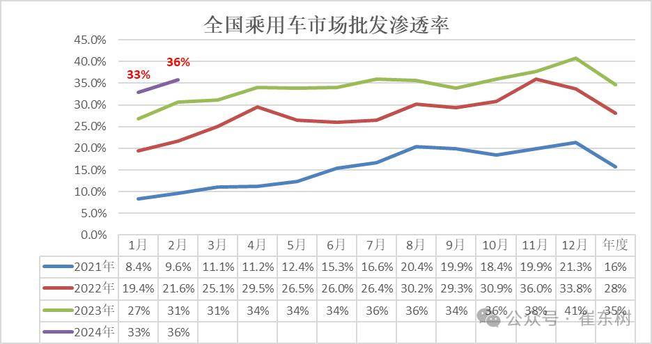 全国新能源乘用车2024年2月批发45万渗透率36%