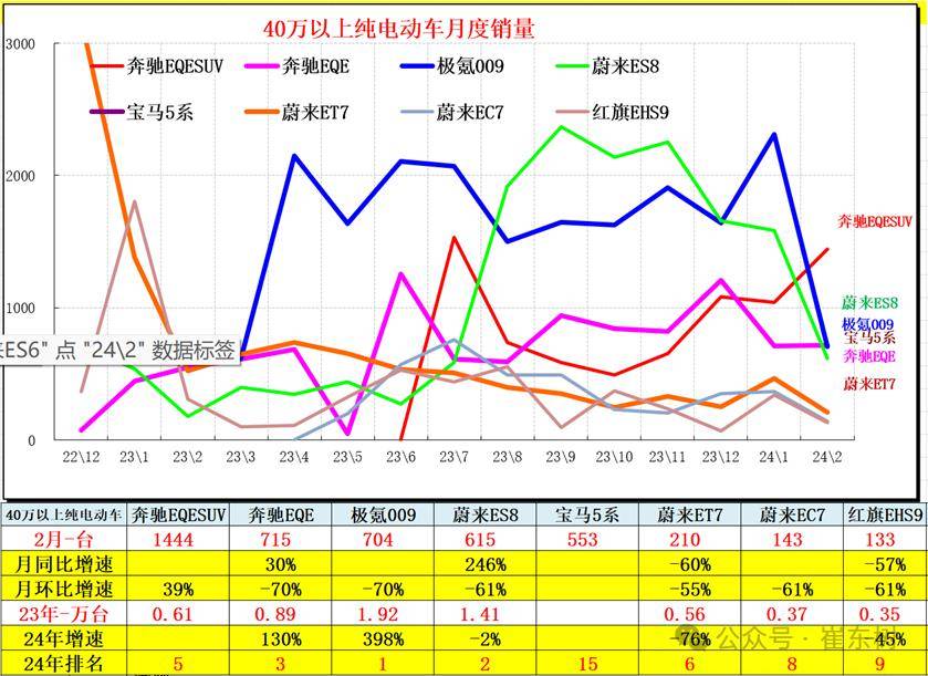 近期40万元以上车型总体较好,消费升级对自主高端接受度大幅提升。其中蔚来ES8在 2023年下半年连续月销超过2000台,2024年蔚来ES8仍牢牢占据自主智能高端SUV主导地位。奔驰EQE上市后也表现不错。