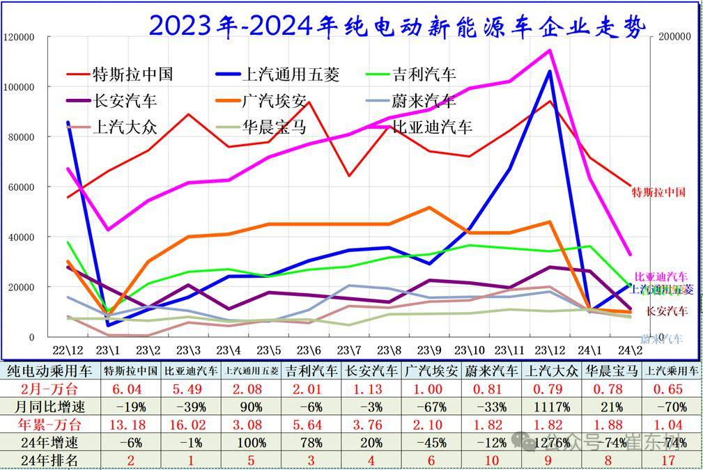 近几年以来纯电动乘用车市场仍然是比亚迪、特斯拉和传统自主品牌为主的格局。2024年2月纯电动车企表现强的是上汽通用五菱、吉利、上汽大众等。而头部车企的比亚迪、特斯拉呈现温和增长,拉动2024年2月总体较强;蔚来等新势力的总体走势较好;广汽埃安等调整较大。
