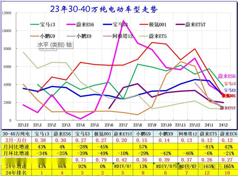 30-40万元市场里有蔚来ES6、蔚来ET5、宝马i3、宝马X3等表现相对较强。蔚来品牌高端车型较强,ES6销量同比实现正增长。