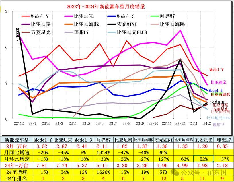 2024年的小型纯电动走势不强,比亚迪元和埃安Y等表现不强。