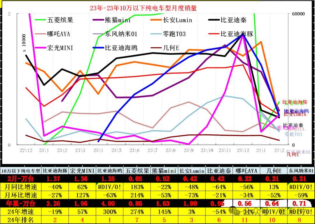 1、2024年2月10万以下纯电动车型