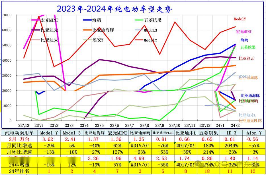 2024年2月纯电动车型表现相对较强的是特斯拉MODEL Y、MODEL3、海豚、比亚迪元、五菱宏光mini和缤果等产品。