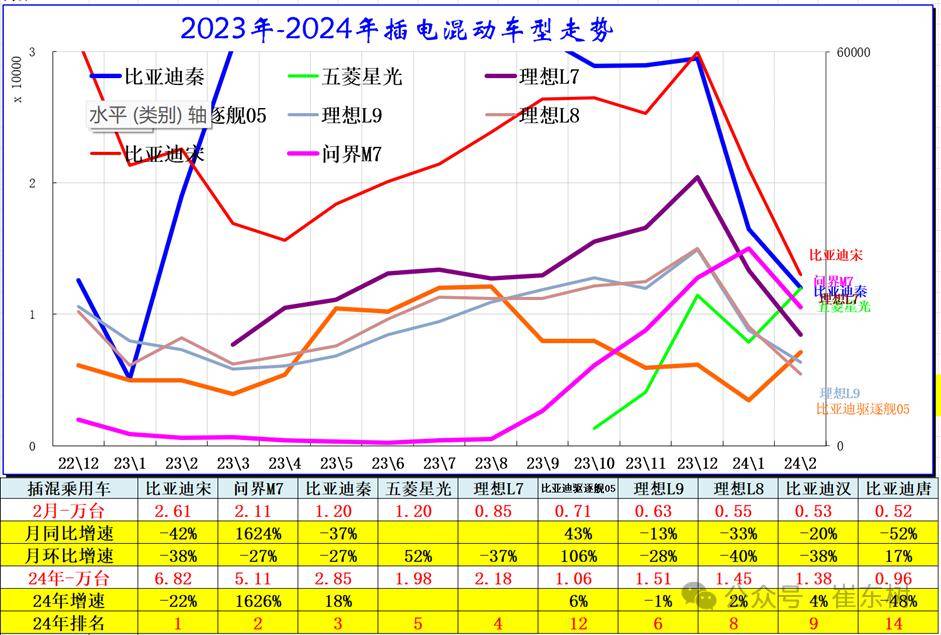 2024年2月份插电混动市场走势分化,主要的厂家是比亚迪处于绝对领先,比亚迪由于销量较高,放到右轴。