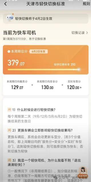 根据平台规则,“轻快切换标准”,包括服务分、安全分、车型分,3项总和低于标准,将暂时只能以“轻快资质”接单,3个月为一个周期,每个周期结束时结算一次。目前,各地轻快切换标准分值并不相同,深圳、福州等地轻快切换标准为345分,天津司机的轻快切换标准是350分。