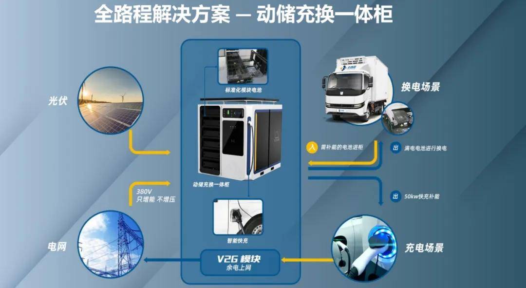 这是我们的一个解决方案,中间的柜子叫做光储充换一体柜,可以从光伏直接接到光储充换一体柜里面,可以接光伏的同时,它也可以接4电380伏的三相电,又可以实现换电,也可以实现给车子充电。右边是我们的货车,其实本身我们生产的是一块标准化的电池,我们用这块标准化的电池来适配不同的乘配车型来适配不同的厂牌,还可以用来做充电的场景。