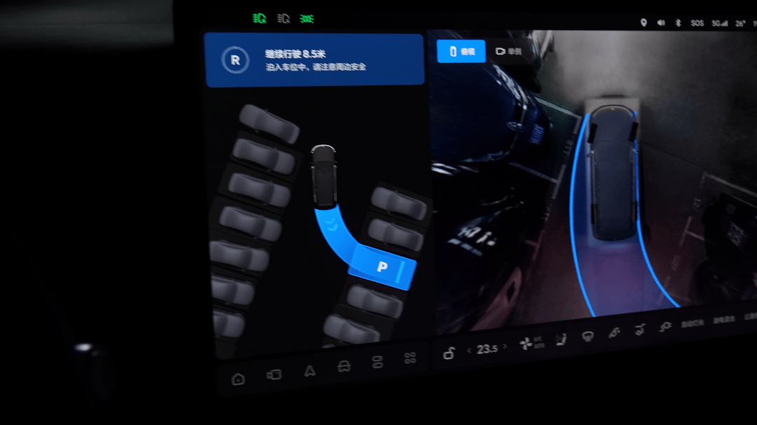 (图:初次使用智能泊车时,要彻底丢手丢脚让它开,还是有点挑战自己胆量的)
