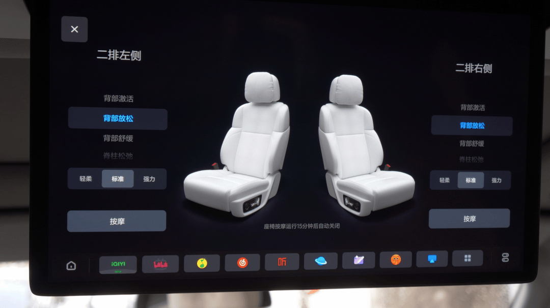 1.排名第四的是座椅按摩,理想L9的座椅按摩是像正儿八经按摩椅的那种机构,底下有机械转子工作的,所以能实现不同的力度,还有八种模式供自由选择,这是让L7和L8车主都嫉妒的,因为他们的按摩是气袋按摩,靠几个气袋的充放气实现座椅表面的起伏,力度比较弱鸡,形式也很敷衍。