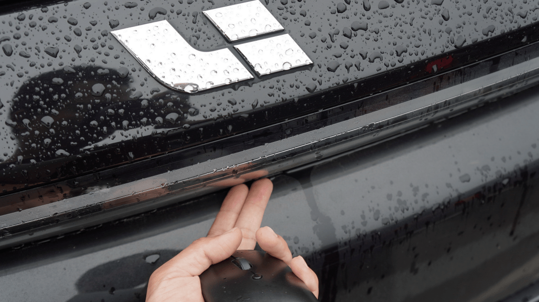 (图:L8后备箱开启按钮在尾部贯穿灯下面藏着,但是触发方式我觉得不够顺手,而且这么按指甲容易刮到车漆,每次都得很小心操作)