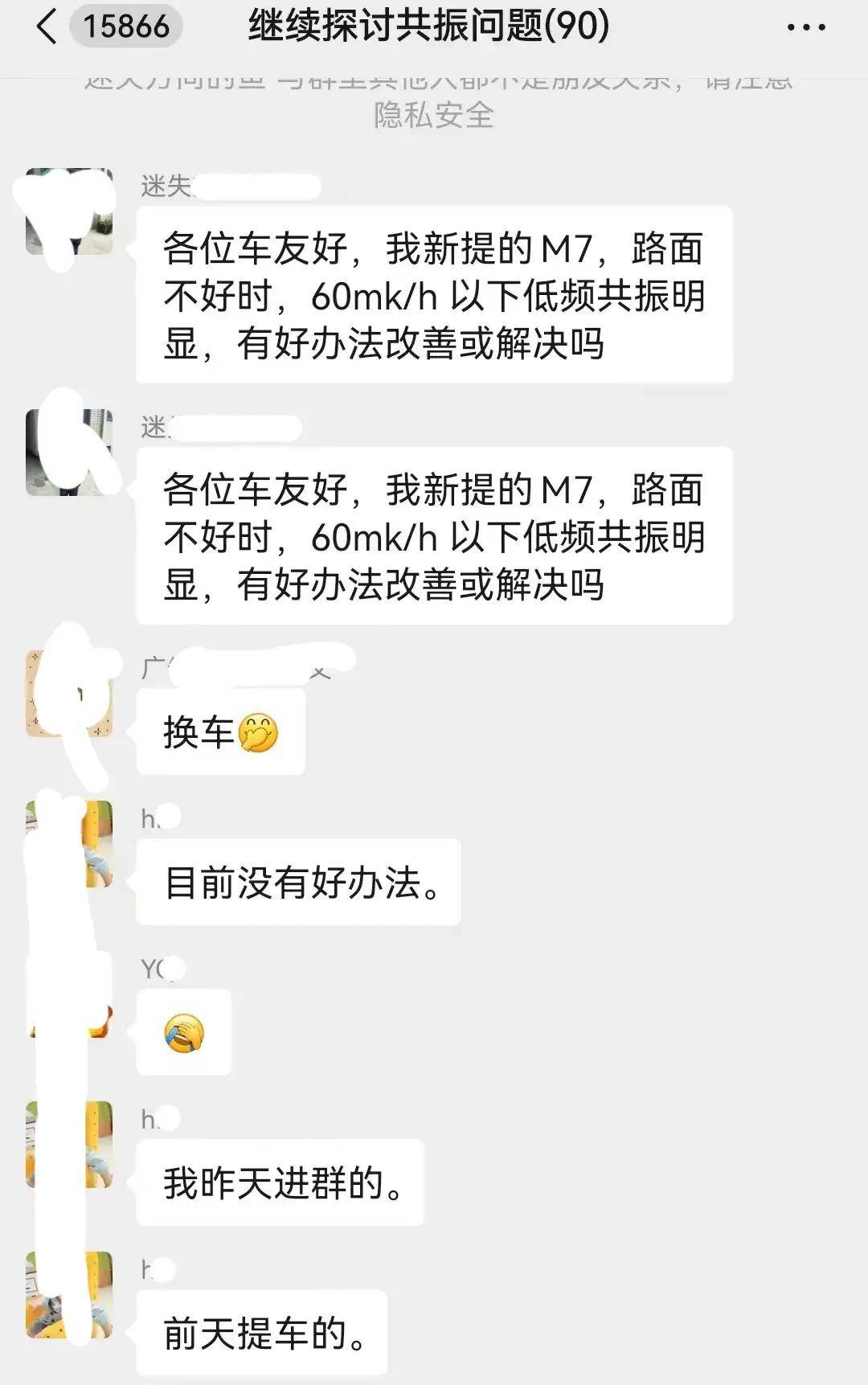 “各位车友好,我新提的问界M7,路面不好时,60km/h以下低频共振明显,有好办法改善或解决吗?”“目前没有好办法。”“我昨天进群的,前天提车的。”2024年7月22日,新进群的两位用户在群内讨论时说。