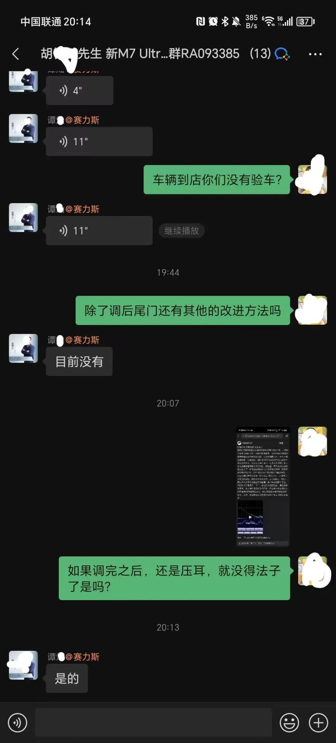 胡先生:“除了调后尾门还有其他的改进方法吗?” 赛力斯谭先生:“目前没有。” 胡先生:“如果调完之后,还是压耳,就没得法子了是吗?”赛力斯谭先生:“是的。”