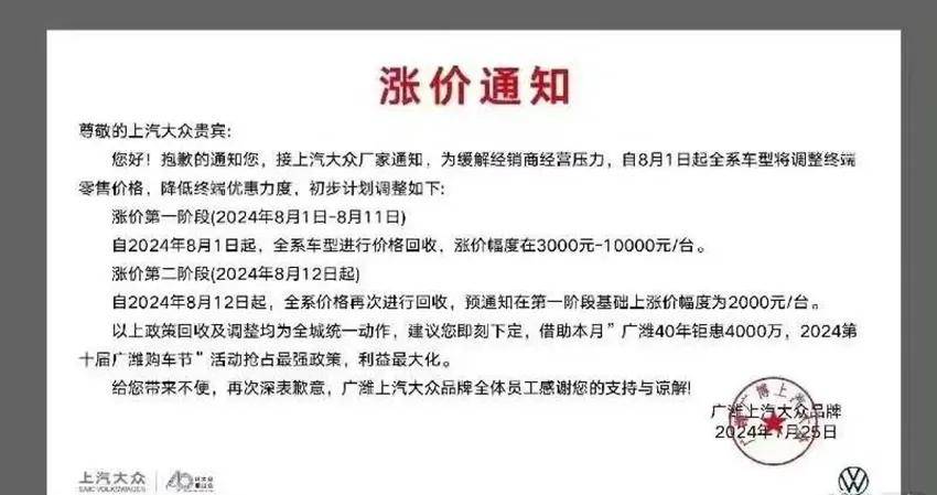 近日,一张上汽大众发出来的涨价通知在网上热传。