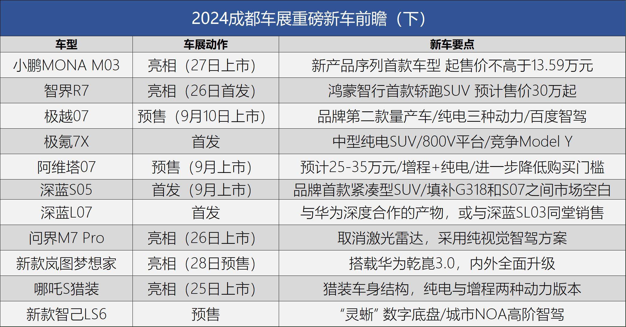 通过本期盘点,我们不难发现诸如智界R7、极越07、阿维塔07、极氪7X等车型的依旧在不断地推陈出新,用更大的空间、前卫的科技感和运动性能吸引着消费者的目光,进而对标像特斯拉Model Y这样的热销车型;而除此之外,像是哪吒S猎装等车型也在不断地尝试新赛道,满足更多细分市场消费人群的购车需求。通过两期盘点相信大家对即将开幕的成都车展又多了几分期待,也请您继续关注搜狐汽车,在8月30日为您带来更多车展新闻。