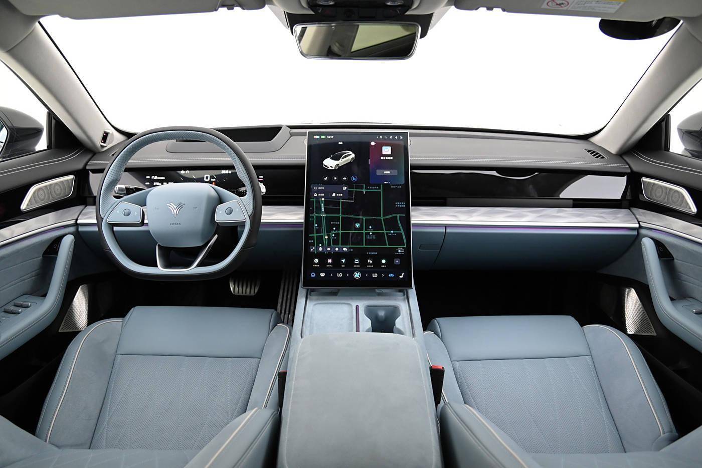进入车内,新车采用了环抱式的设计风格,从门板到中控很有整体感,其中控采用三联屏组成的信息显示系统,整体设计和极越01相同,左侧为车速以及导航信息,中间和右侧预计以娱乐为主。新车采用了半幅式方向盘,换挡操作则是在屏幕上完成,和新款Model 3一样。