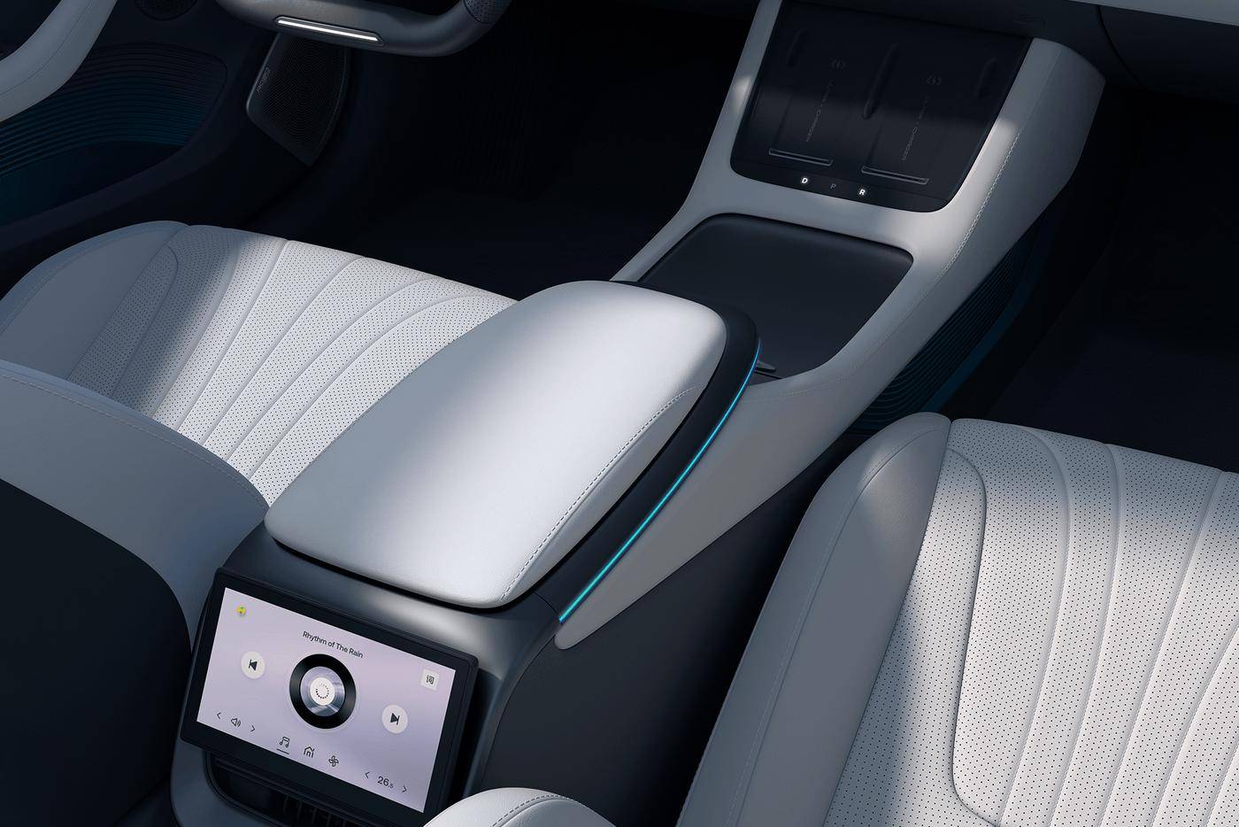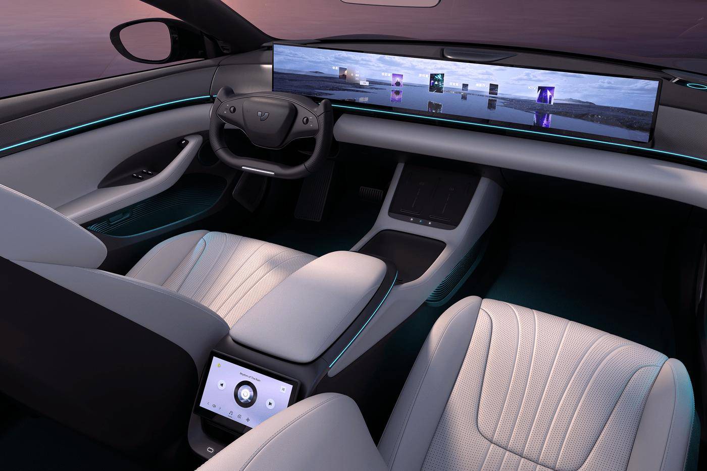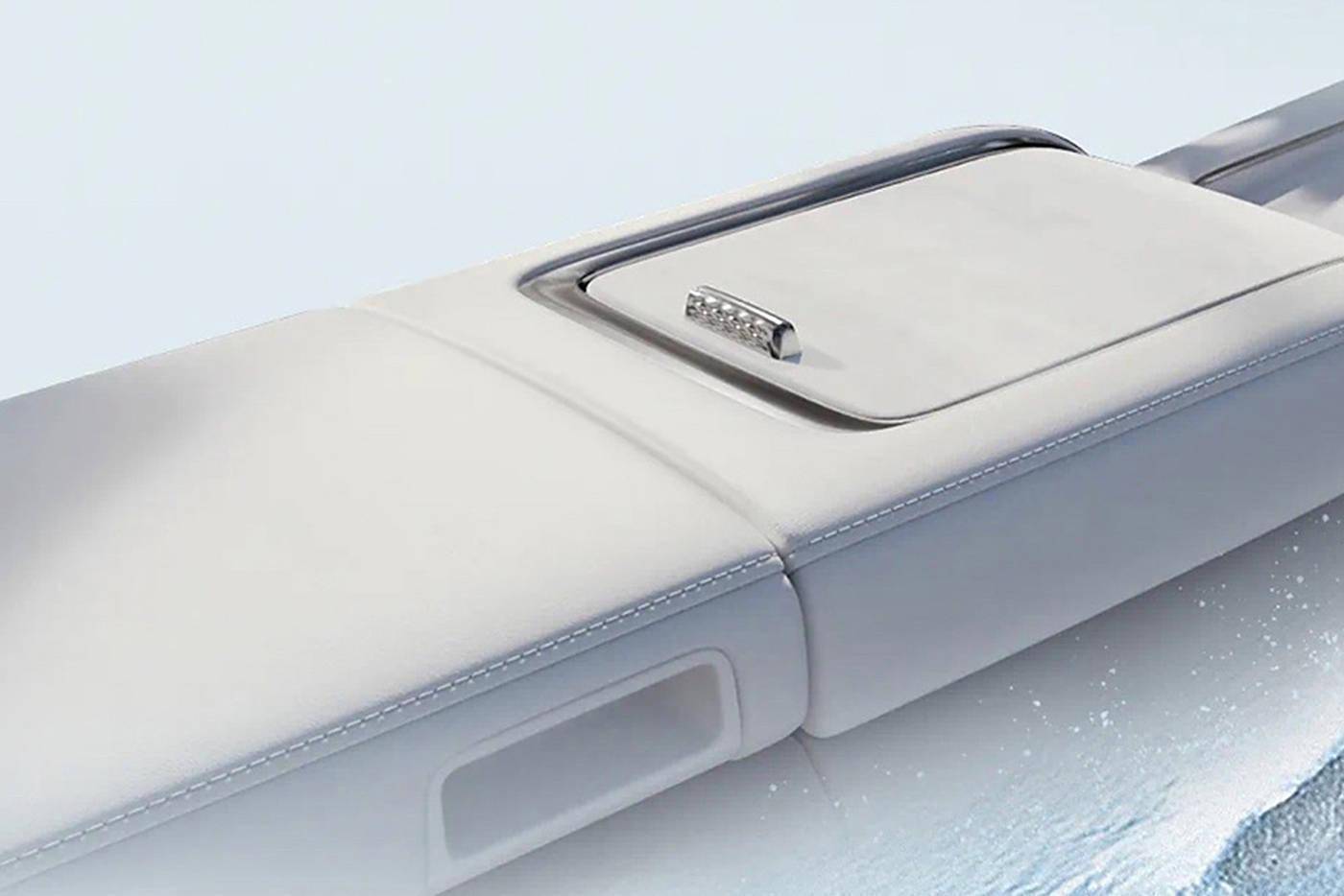 新车在中控扶手后面还为后排乘客准备了一个小屏幕,但相比极越01预计有所升级,功能更多了一些,可以进行音乐、空调、座椅加热等的调节,下面还有充电接口。此外,像AI智能大灯、车外语音控制等预计都将有所配备。