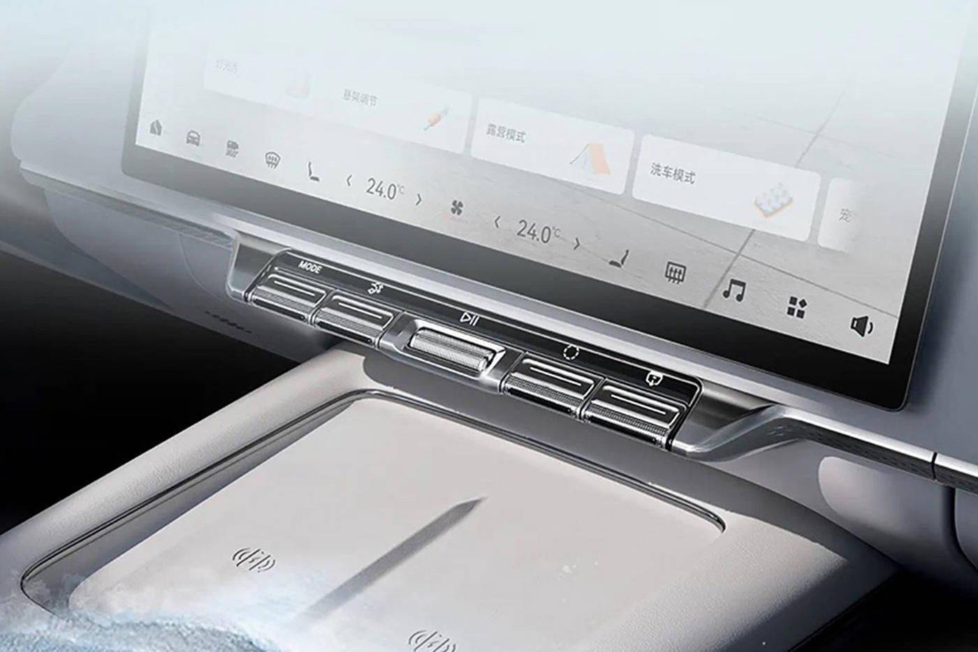 根据官方释放的内饰预告图来看,新车将配备大尺寸悬浮式中控屏,下方则为琴键式机械按键,主要为多媒体控制以及常用功能按键,提升盲操便利性。同时,新车配备双手机无线充电位、游艇式中台、中控台上方的葵花纹中置音响、浮光涟漪氛围灯以及拥有千鸟格打孔的座椅等。