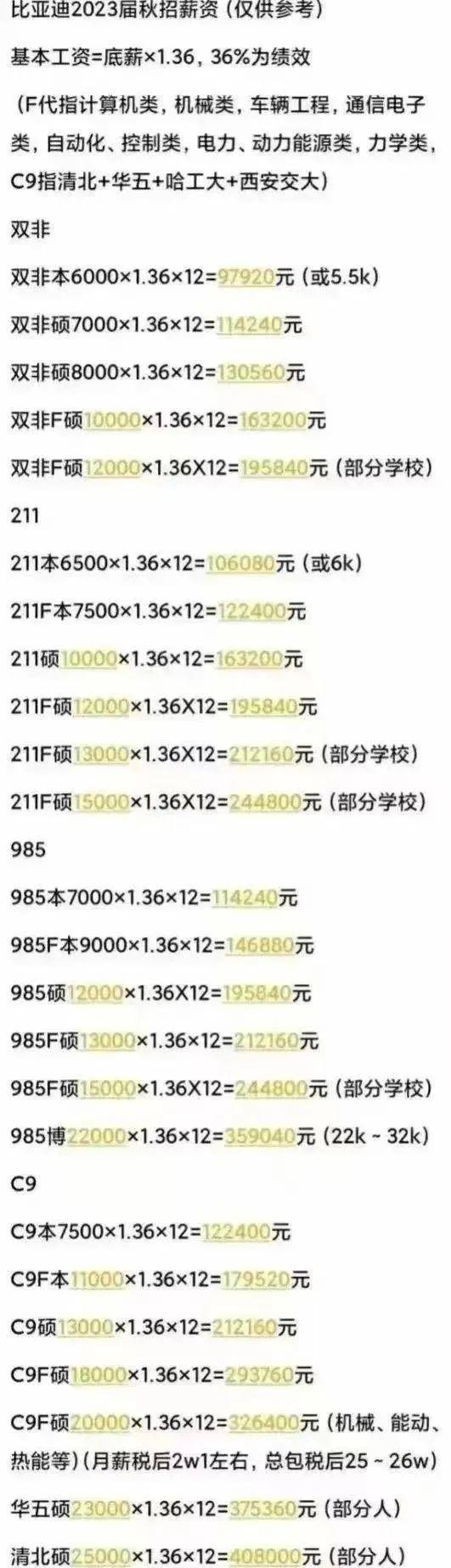 比亚迪校招薪资曝光,985落后于C9高校,年薪最大差异达到40万
