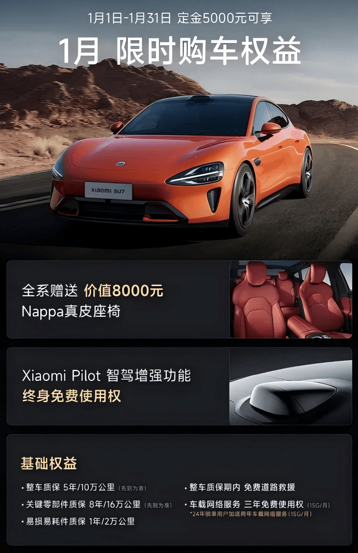 与12月购车权益相比,2025年1月全系继续赠送价值8000元的Nappa真皮座椅和Xiaomi Pilot增强智驾功能终身免费使用权。在此基础上,新增“车载网络服务三年免费使用权(15G/月)”“2024年锁单用户加送两年车载网络服务(15G/月)”。以上购车权益,在2025年1月1日-1月31日期间支付5000元定金的用户即可享受。