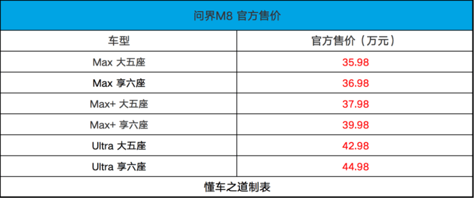【懂车之道 产品】近日,懂车之道获悉,问界M8正式发布上市,共推出6款配置车型,官方售价区间为35.98万-44.98万元。新车定位中大型SUV,提供5座、6座两种布局,下面,和大家一起来看看新车的产品力如何?