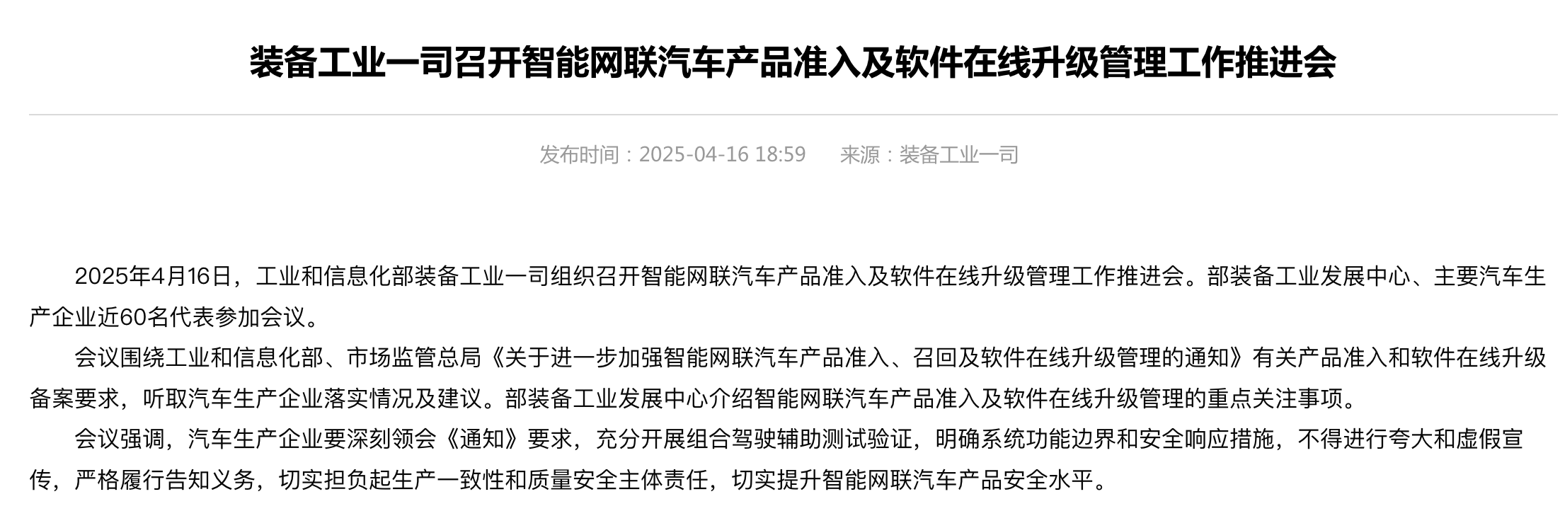 此前4月17日,工业和信息化部装备工业一司在工信部官网上发布了一条标题为《装备工业一司召开智能网联汽车产品准入及软件在线升级管理工作推进会》的公告。公告中强调:汽车生产企业需要明确系统功能边界和安全响应措施,不得进行夸大和虚假宣传,严格履行告知义务,切实担负起生产一致性和质量安全主体责任,切实提升智能网联汽车产品安全水平。