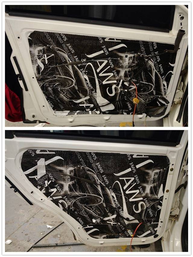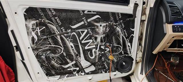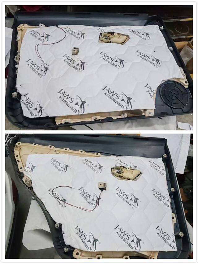 前后门板第一层隔音:使用大白鲨隔音材料紧贴门板内层,增强钢板刚性,有效抑制共振与车外噪音渗入