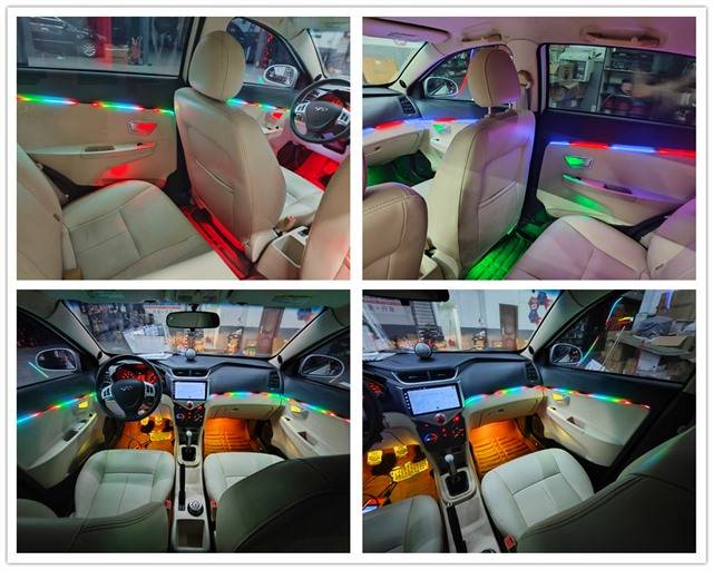 除了听觉升级,还加装了一套全车幻彩氛围灯系统。随着音乐节奏律动,灯光在脚踏区、中控、门板轮廓处自由流转,夜间行车氛围满满。不仅提升了车内视觉质感,也让旅途充满乐趣与情调。
