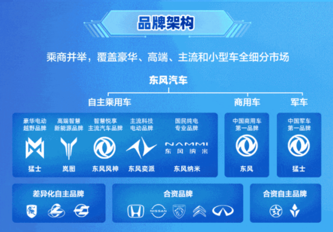 东风汽车新架构体现“乘商并举,覆盖豪华、高端、主流和小型车全细分市场”,分自主乘用车、商用车、军车、差异化自主品牌、合资品牌、合资自主品牌等六大类、总共17个品牌。