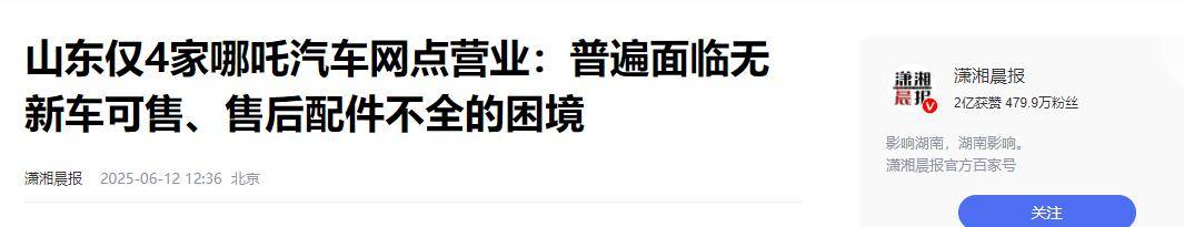 潇湘晨报2025-06-12——山东仅4家哪吒汽车网点营业:普遍面临无新车可售、售后配件不全的困境