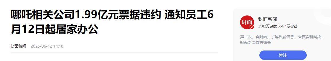 封面新闻2025-06-12——哪吒相关公司1.99亿元票据违约 通知员工6月12日起居家办公