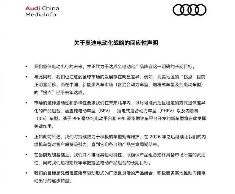针对各种错误解读,奥迪被逼无奈,发出《关于电动化战略的回应性声明》。