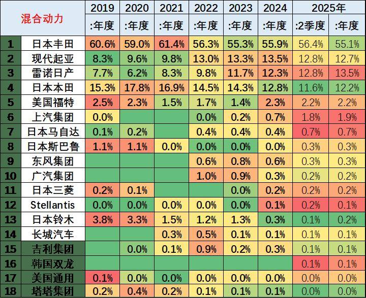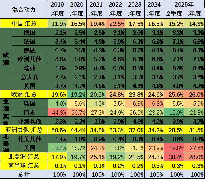 混合动力市场是日韩强势的占据,丰田、本田、日产和现代的混动表现很强,2025年占据94%,其它大部分企业的混动份额均不超过1%。近期丰田和马自达在2025年的混动市场份额表现较好。