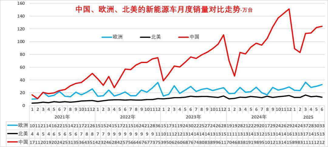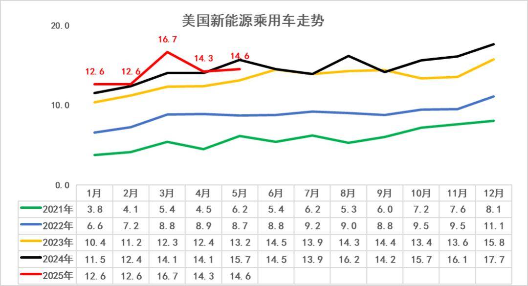 今年1-6月美国新能源的销量77万台、增速2%,相对近几年增速最低。由于即将实施高关税的涨价担忧,美国新能源车6月销量12万台、降9%的增长偏弱,且环比降11%。