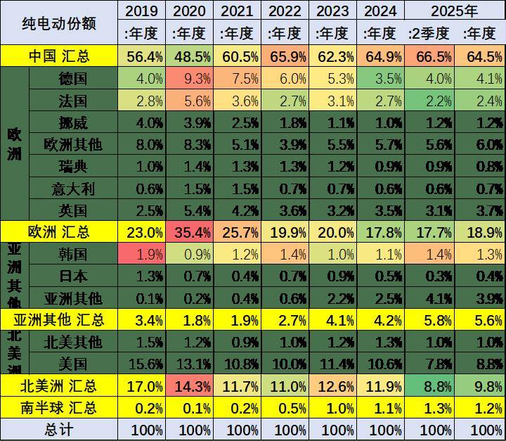 中国在世界纯电动车市场份额表现相对平稳,2017-2018年是在60%左右的份额;2019-2020年份额稍微有所下降,降到2020年的48.5%的份额;2022年又回升到65.9%的份额;2023 -2024年的份额低于65%的份额水平;2025年1-6月中国在世界纯电动车市场份额达到64.5%,较2024年2季度增加1.9个百分点。