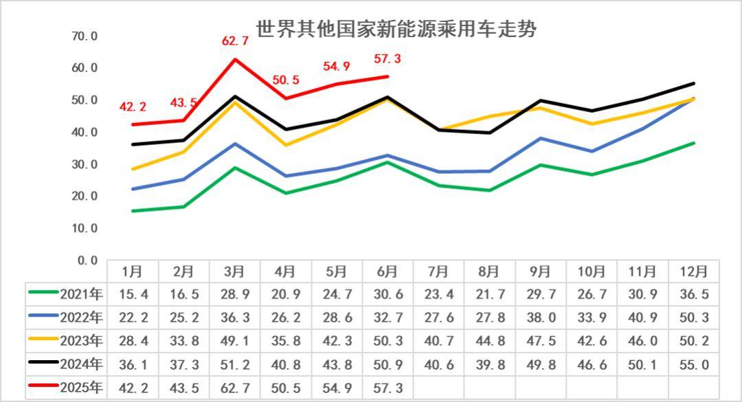 2025年世界新能源车起步较低,随后2-6月恢复高增长。由于春节较早,中国新能源的年初销量较低,春节后2-6月依托国家报废更新和以旧换新政策恢复高增长,推动世界新能源车高增长。