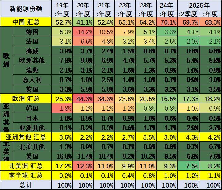 2021年全年的欧洲新能源市场受疫情影响,新能源增长较弱。2022年仍受到疫情影响,欧洲2022年较2021年份额下降较大,2023-2024年欧洲份额继续小幅下降。2025年1-6月欧洲新能源的世界份额达到18.2%,较去年同期的16.6%增加1.6个百分点。