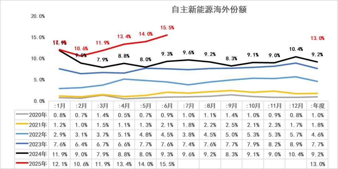 2025年6月自主新能源乘用车海外市场销量份额15.5%。由于自主新能源出口表现较好,因此自主新能源乘用车海外市场销量份额从2024年的9.2%,上升到今年1-6月的13%,上升较大。