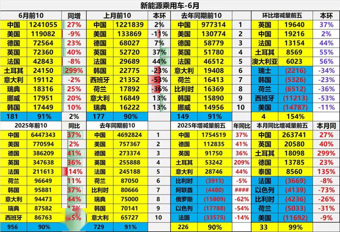 2025年1-6月世界新能源乘用车达到956万台,同比增31%。6月世界新能源乘用车达到181.4万台,同比增22%,环比增2%。