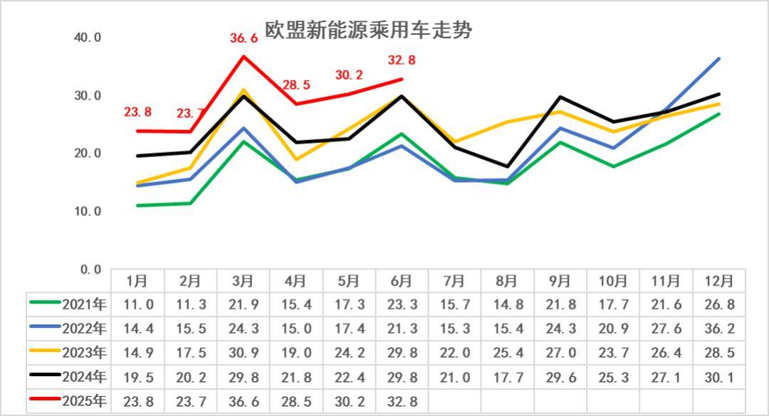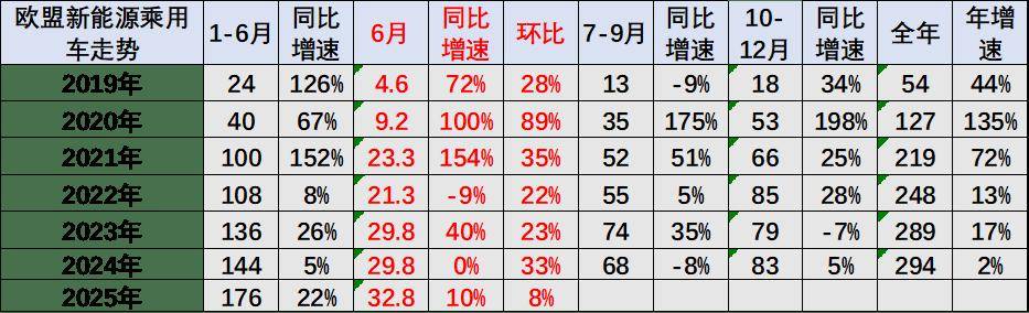 欧洲新能源乘用车今年1-6月销量176万台,较去年同期增量32万台,增22%;初步统计欧洲新能源乘用车6月33万台、增10%。