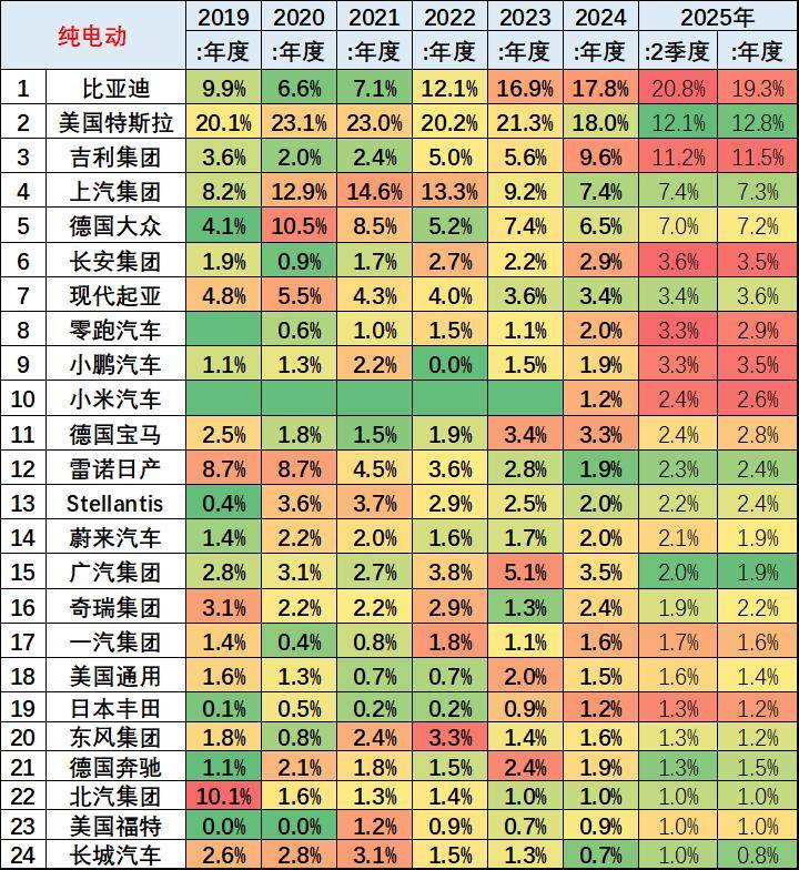从车企的纯电动份额来看,比亚迪的份额总体来看持续上升。从2017-2021年总体保持在7%以上的份额水平,但2022年的份额上升到12%,2023年的份额上升到17%,2024 -2025年的份额突破到19%的表现良好。