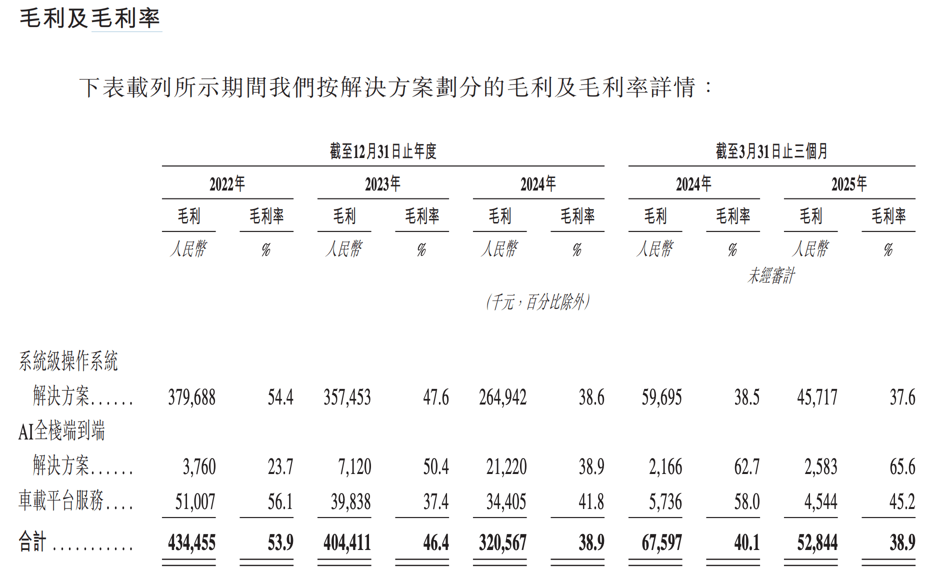 尽管研发力度不减,公司核心指标却呈现“量增利减”的矛盾:截至2025 年6月30日,斑马智行累计在量产车中搭载了超过800万套智能座舱解决方案。2022 年至 2024 年,智能座舱解决方案年搭载量从 83.5 万台增至 233.4 万台,复合年增长率高达 67.2%,但收入未同步增长,毛利率更从 2022 年的 53.9% 持续下滑至 2024 年的 38.9%。