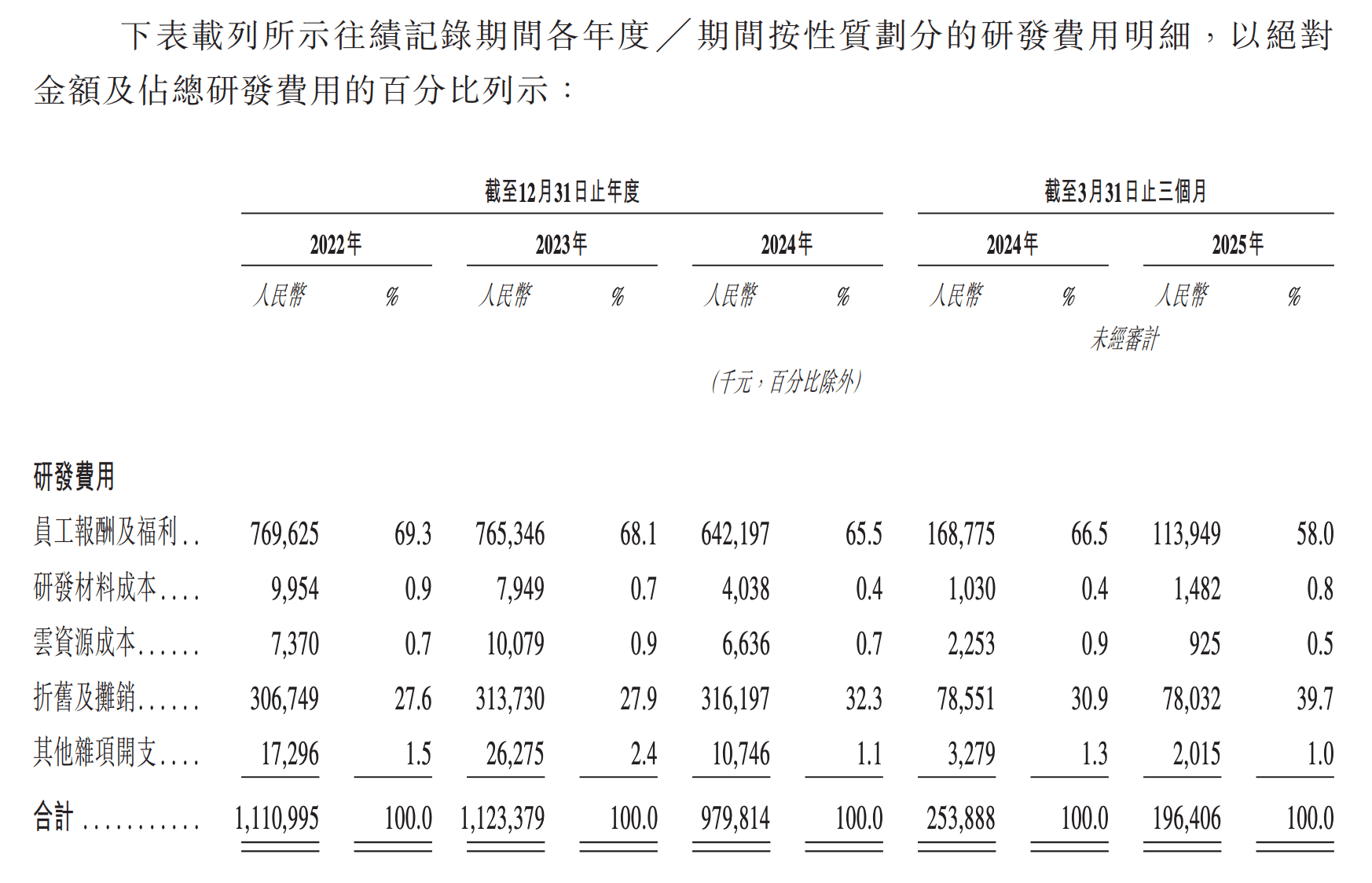 斑马智行的转型方向与研发投入的变化,同样值得关注。2022-2024 年,研发费用中“员工报酬及福利”占比从 69.3% 降至 65.5%,而“折旧及摊销”的费用占比从 27.6% 升至 30.9%(2025 年一季度达占比近四成)。