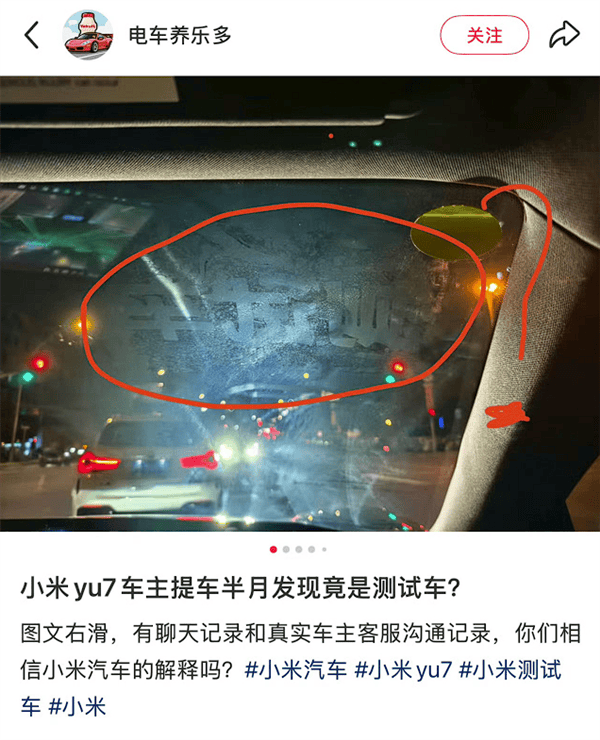 近日,部分小米YU7车主在提车后发现,车辆的前挡风玻璃或后挡风玻璃上存在“测试车”静电贴残留的痕迹。这一现象引发了车主们的关注,有车主将相关情况分享至社交平台,引发了讨论。
