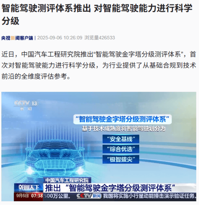 9月6日消息,据央视新闻报道,中国汽车工程研究院近日推出了“智能驾驶金字塔分级测评体系”,首次对智能驾驶能力进行科学分级,为行业提供了全维度评估参考。该体系基于技术成熟度将智能驾驶划分为“安全基线”、“综合优选”和“极智拔尖”三个层级。安全基线层以法规符合性为核心,综合优选层以“好用”为标准,极智拔尖层则针对复杂临界场景开展极限工况测试。中国汽车工程研究院智能网联汽车测评研究中心主任李朝斌表示,这套体系填补了国内智能驾驶行业分级分层测评体系的空白,有助于企业开发智能驾驶产品,同时解决消费者选车难题。